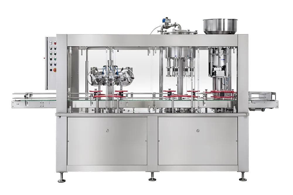 – Περιστροφικό πληρωτικό 8 βαλβίδων για πλήρωση με βαρύτητα, αυτόματη κίνηση, μηχανική και πνευματική ανύψωση φιαλών, με δίσκο ρυθμιζόμενου ύψους και αστέρια φόρτωσης και εκφόρτωσης