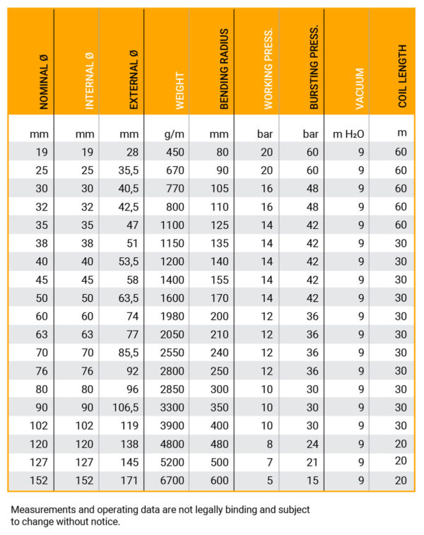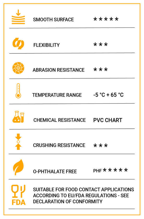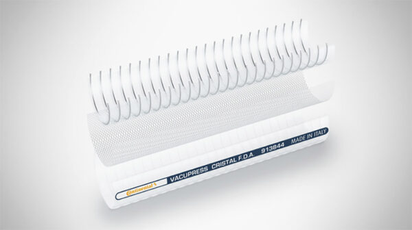 Σωλήνας δύο στρώσεων από μαλακό PVC, εγκεκριμένος για τρόφιμα, με ενσωματωμένο σπιράλ από γαλβανισμένο χάλυβα με ενίσχυση από πολυεστερικό νήμα, για αναρρόφηση και παροχή στερεών και υγρών, καθώς και τροφίμων.